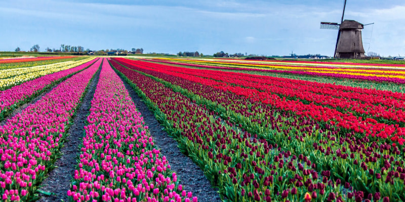 Historical cities, flower fields, spring