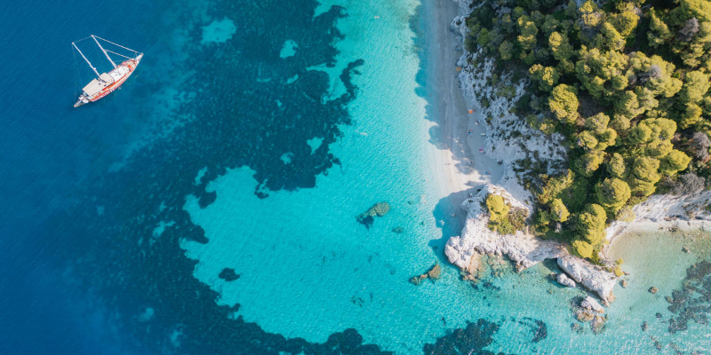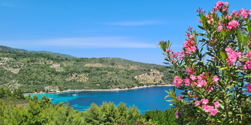 Unlike many other Greek islands, the Sporades are known for their lush, green landscapes. Dense pine forests, olive groves, and Mediterranean flora shape the scenery, creating a striking contrast to the more rugged, arid islands elsewhere in Greece. Mountains, hidden coves, and the turquoise waters of the Aegean come together to form a setting that feels tailor-made for nature lovers and active travelers.