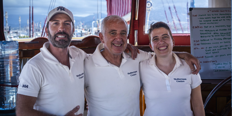 A homely atmosphere prevails on board: walking in our socks on the wooden floor, ceramic tiles on the doors, and a delicious meal every day: from spaghetti bolognese to fresh fish with caponata, a stewed vegetable dish.