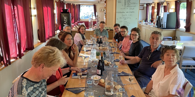 The ship’s character reveals itself most clearly in the spaces everyone uses together. There is one dining room, one lounge, one open deck. Because everyone gathers in the same places, conversations continue rather than disperse. In the morning, guests pour their coffee while the tour leader outlines the route ahead, pointing out villages, river crossings and good places for a stop. In the afternoon, guests slip off their cycling shoes near the entrance, drinks are ordered, and everyone compares the day’s small discoveries.