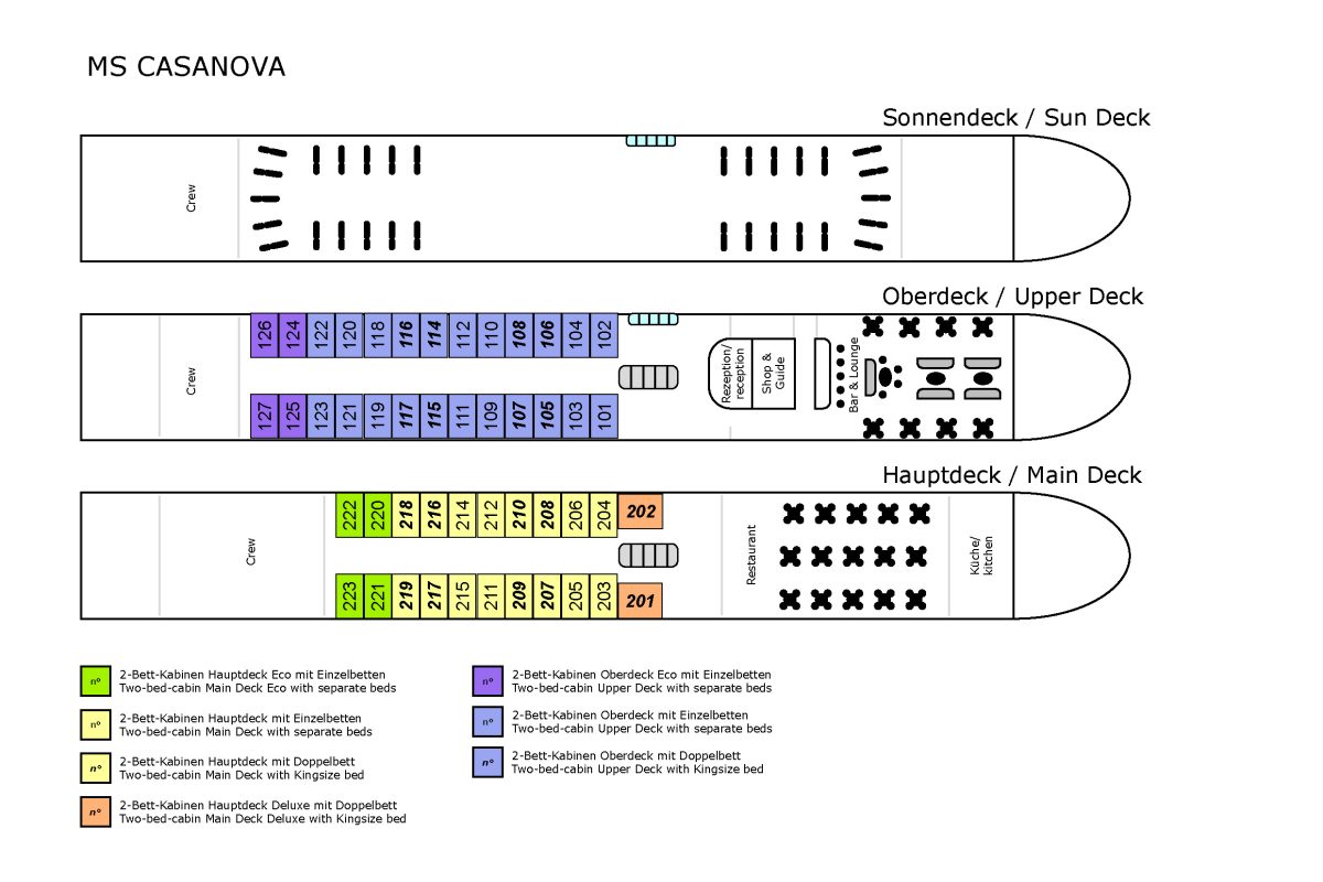 The MS Casanova has 48 outside cabins on two decks – each approx. 12 m² in size and equipped with shower/WC, hairdryer, satellite TV, safe (deposit required), minibar, on-board telephone and individually adjustable air conditioning.