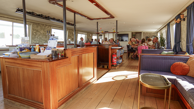 The inviting salon on the upper deck is the social heart of the ship. Enjoy delicious meals, a good glass of wine at the cozy bar, or a quiet moment in the lounge area. Large windows offer panoramic views of the passing landscape. Through the French doors, you step onto the spacious front deck – a perfect place to relax in the sun or under the shaded canopy. The entire ship is air-conditioned and Wi-Fi is available throughout.