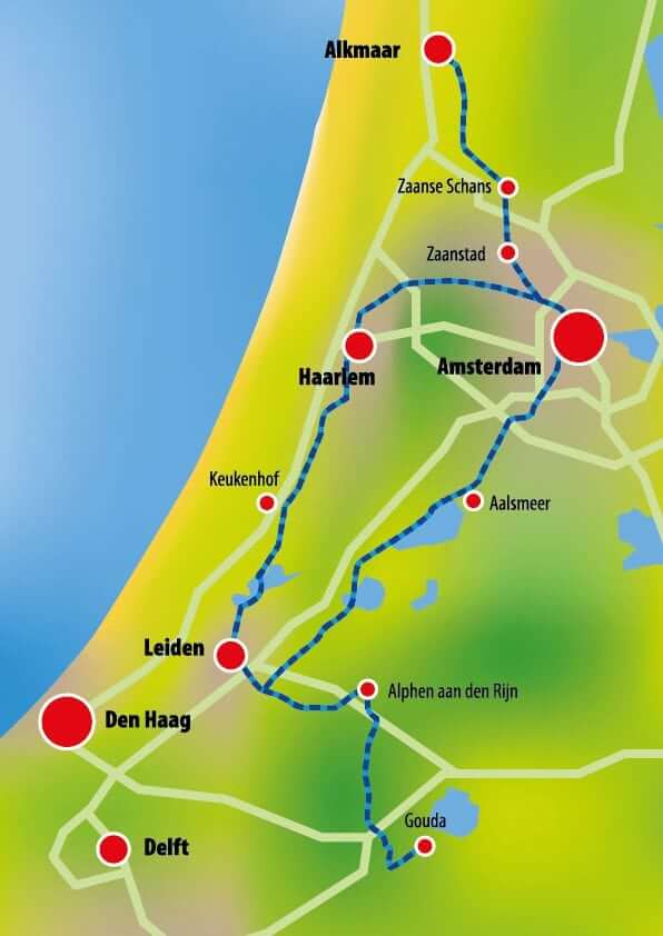This wonderful bike and barge trip that starts and ends in Amsterdam, takes you through the provinces of South- and North Holland while spring flowers are in bloom. You will spend time in the historical cities of Haarlem, Leiden, Gouda and Alkmaar and learn about the water management of these lowlands at the North Sea.