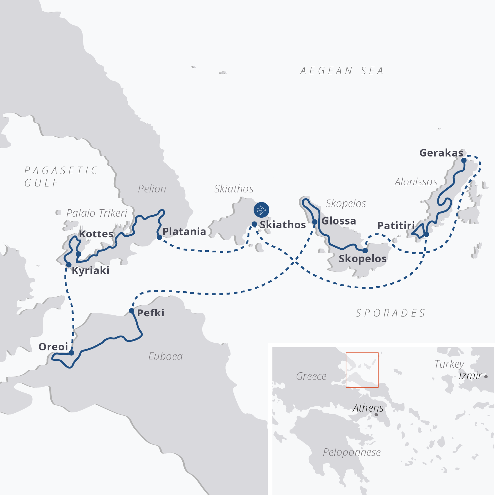 On your last cycle tour, you can once again look forward to fantastic and varied panoramas. The tour first takes you for 25 km along the beautiful coast of Pelion. Take a coffee break in the harbor town of Milina before tackling the final climb of your journey and finally reaching the port of Platania after a descent through a beautiful forest. Your boat will be waiting for you there and you will cross over to the neighboring island of Skiathos. In the afternoon, a transfer will pick you up from Skiathos town and take you to the monastery of Evangelistria and the picturesque Parissis winery, where you can enjoy not only a fabulous view of the islandβs capital, but also some of the best wins of the Spora islands. Later, over a last delicious dinner on board, you can look back on a vacation week full of experiences in one of the most scenic regions of Greece and say goodbye to your guides and crew.