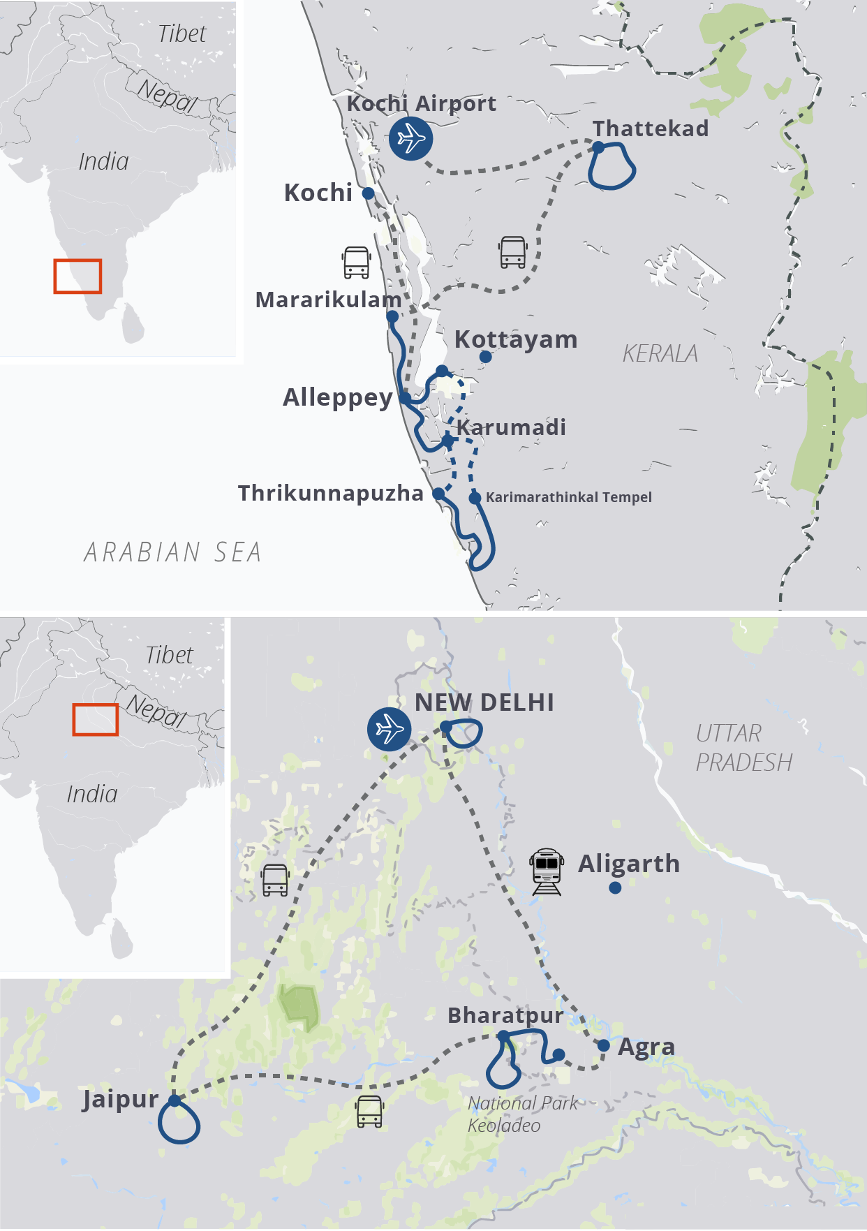 Flights: It is recommended that you book your flight through your travel agent. Please note that you have to book your outward flight to Kochi (Cochin International Airport / COK) and the return flight from Delhi (Indira Gandhi International Airport / DEL).