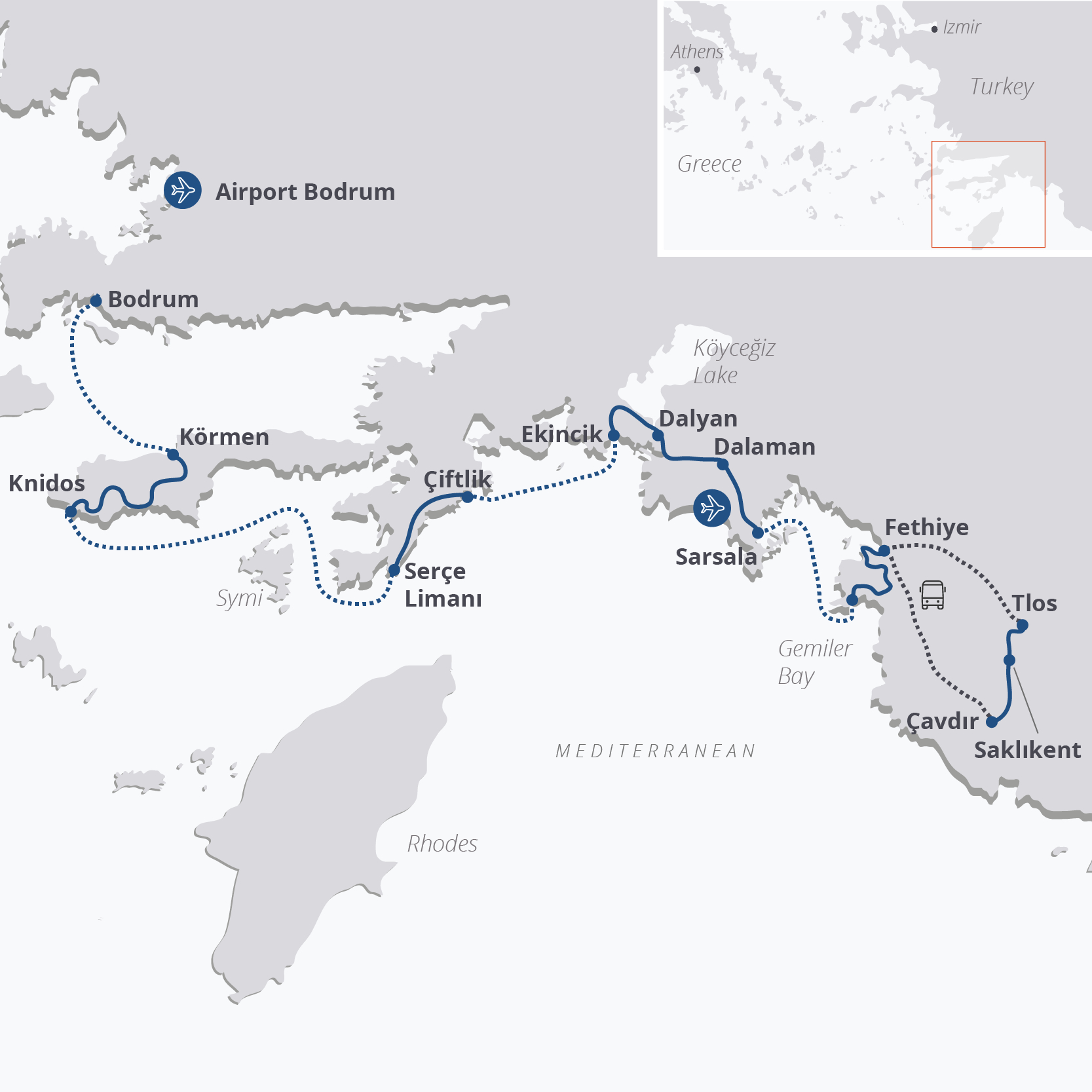 Explore the Lycian coast between YalΔ±Γ§iftlik and Fethiye by boat and bike! Spend a week on our charming floating hotel that is sure to fulfil even the highest expectations. Be taken back into the distant past as you explore the natural wonders and historical sites accompanied by a competent tour guide. We discover the ancient Rock Tombs of Dalyan, carved into the cliffs by coastal Lycians, and the breath-taking scenery of the Saklikent Canyon. We spend our nights in secluded bays and either being rocked to sleep by the gentle murmur of the waves, or heading out to enjoy the lively harbour towns and villages with their plentiful cafes and bars. This tour is part of our Islandhopping PLUS program. The PLUS tours offer our β¦