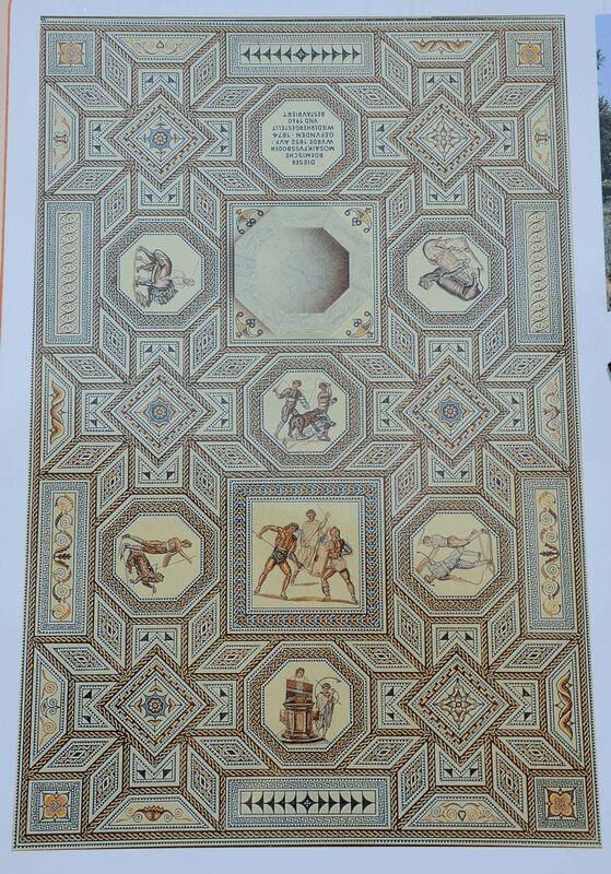 Start your first cycling ride from Schengen, following the Moselle Valley. Along the way, visit the small village of Nennig, near todayβs final destination of Remich. Take in the sights of an old Roman villa, complete with a tile floor that remains in its original place. The centerpiece of the villa, the tile floor, is made up of 3 million (!) individual pieces and depicts scenes from gladiator games in the amphitheater.
