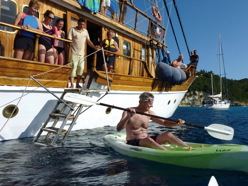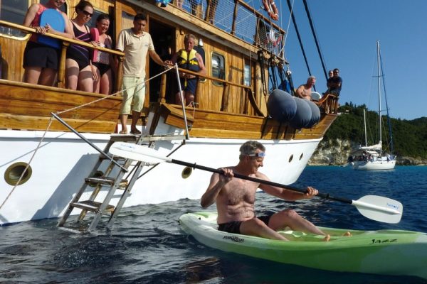 On board of the Panagiota, a two-masted wooden motor sailer, this multi-adventure cruise takes us to the Ionian Islands spread out along the west coast of Greece. Here we see Hellas at its greenest. This tour takes us from Corfu to the Island of Lefkas, with its white chalk cliffs and picture perfect beaches as well as to the Island of Cephalonia with its picture perfect village of Fiskardo and the enchanting Melissani Cave. On Meganisi and Paxos – an island all covered in olive trees – where time seems to have stood still, we may have unforgettable insights into traditional Greek island life. For seven days we explore the unique island and coastal world by boat & bike, canoe, and on foot. This family-friendly cruise leaves a lot of room for fun, games and spontaneity. Biking, hiking, canoeing, swimming or relaxing on board: You decide each day what you feel like doing. Our tour guide is familiar with the country and gladly gives advises and makes suggestions, accompanies us at the various activities and can tell us a lot about the lively history of Greece.
