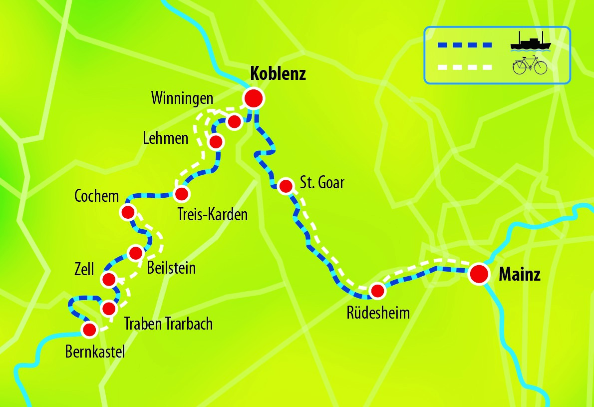 Discover varied nature, immerse yourself in history and experience two of Germany’s most famous wine-growing regions along the beautiful rivers Rhine and Moselle on this wonderful trip. Where the Celts settled and the Romans introduced viticulture, the Rhine and Moselle and the excellent cycle paths along their banks connect all the sights on this tour by bike and boat. The start and end point is the Roman city of Koblenz, where the Moselle flows into the Rhine at the “Deutsche Eck”.